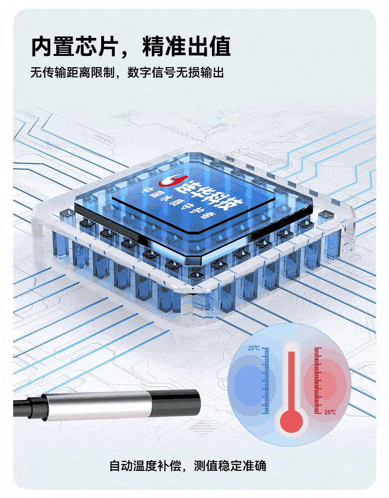 2、采用數(shù)字電極技術(shù),突破傳輸距離限制,默認5米線長(支持定制),結(jié)合自動溫度補償功能,確保戶外檢測信號穩(wěn)定、測量精準;